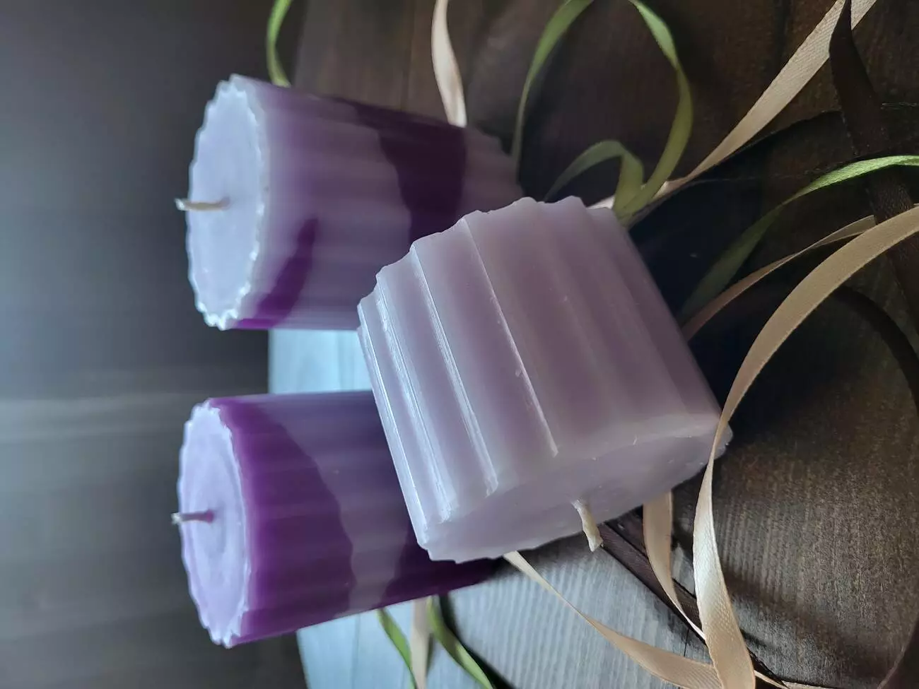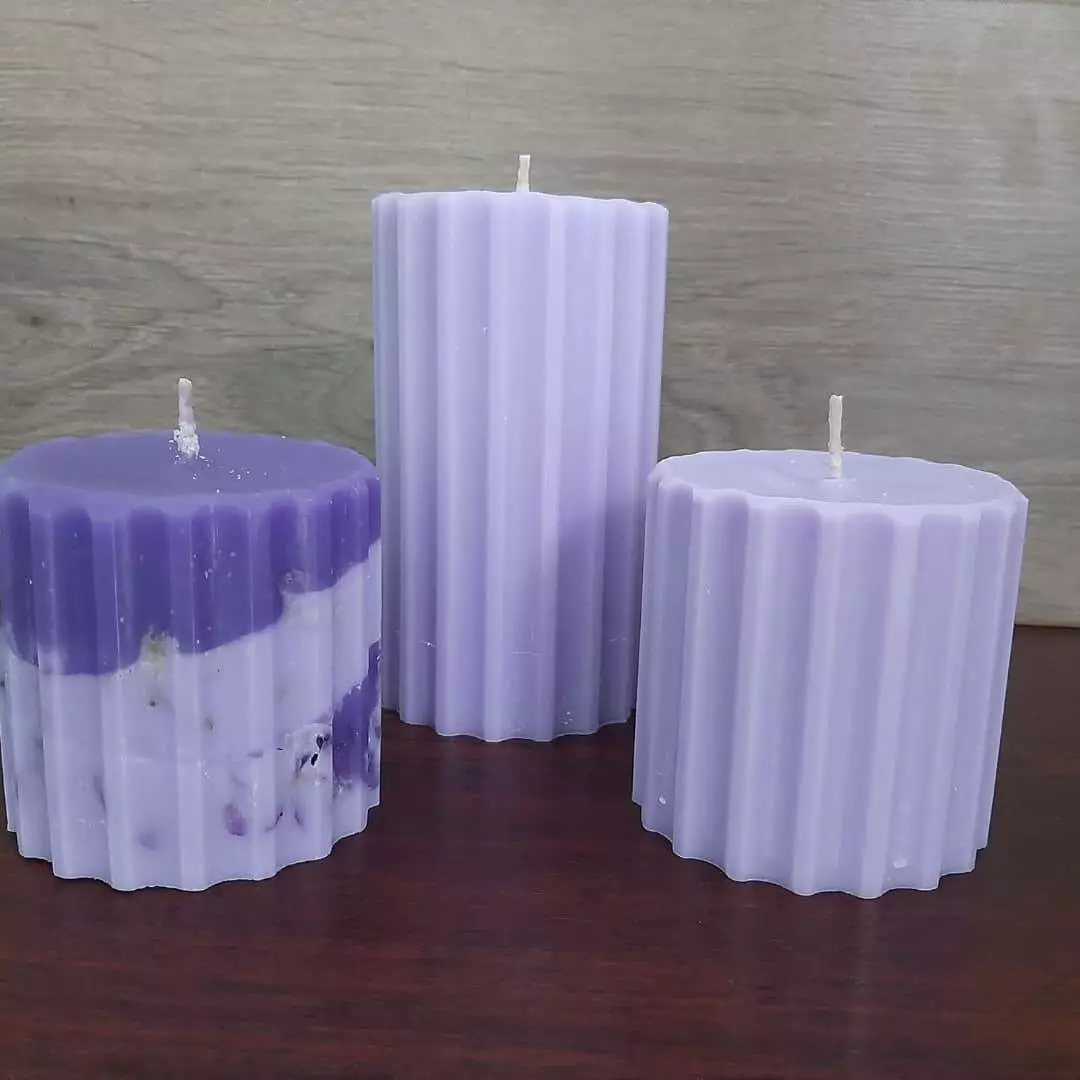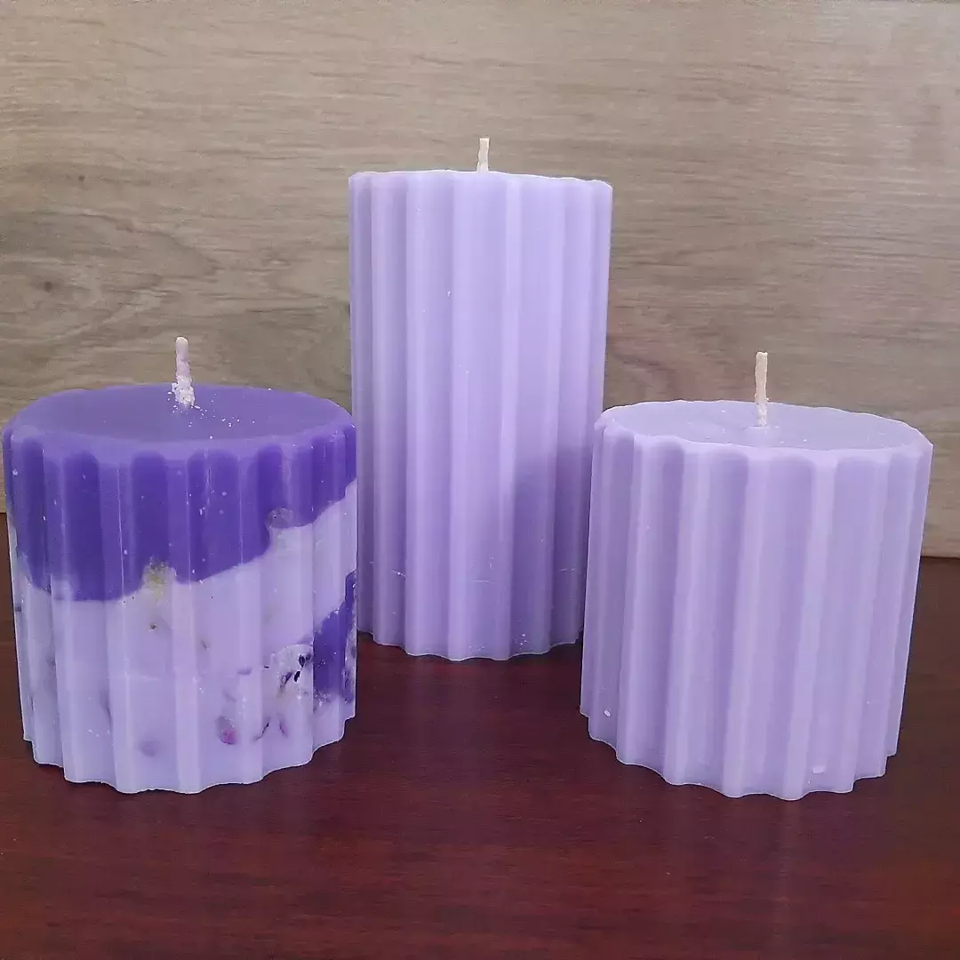Рифлені свічки бузкового, ніжно - фіолетового та яскраво - фіолетового кольору з ароматом бузку. Висота такої свічки 7 та 14 см, діаметр 7 см. можна компонувати набори з різної кількості. Горять якісно, бо натуральний гніт і якісна свічна маса