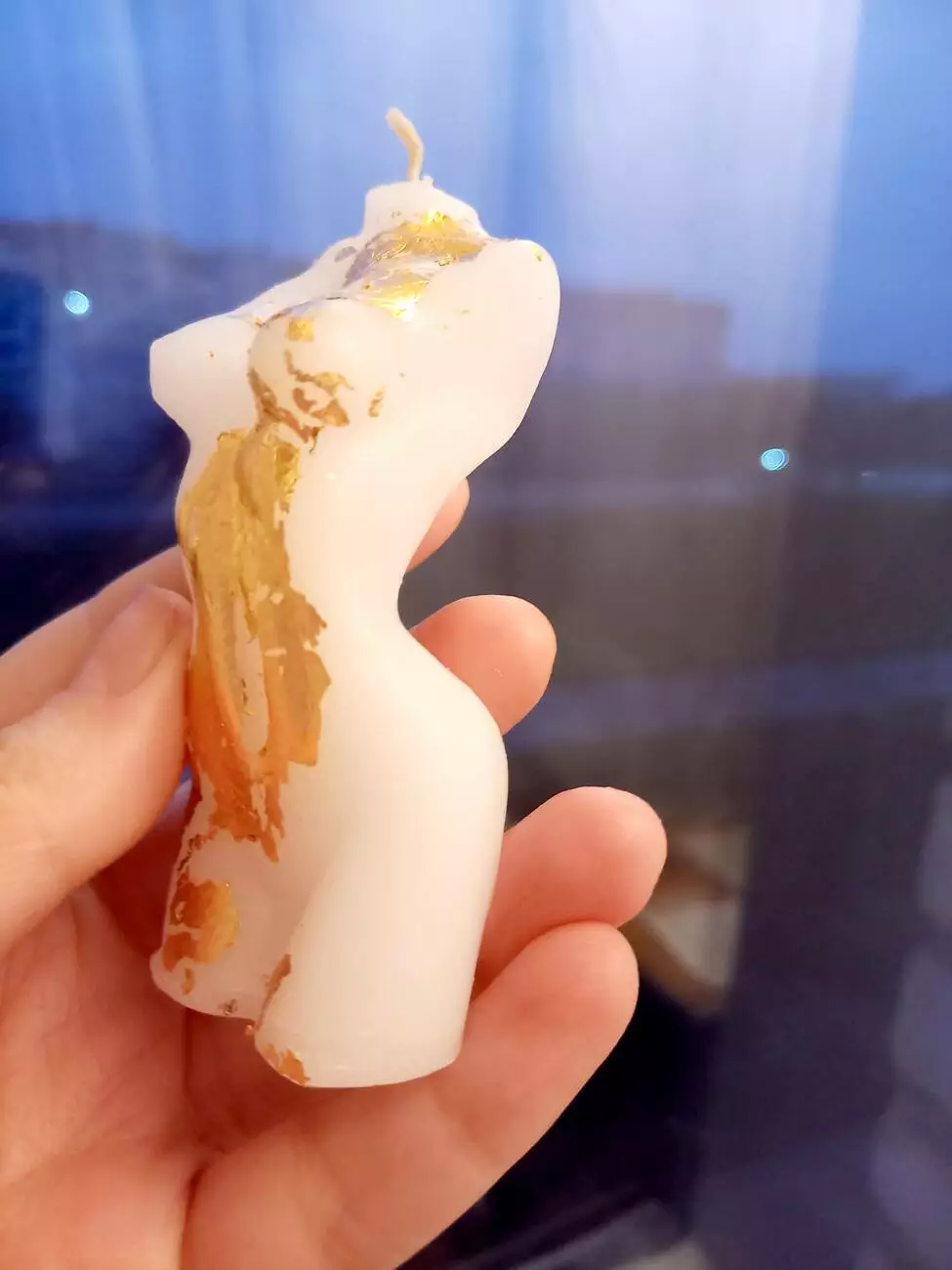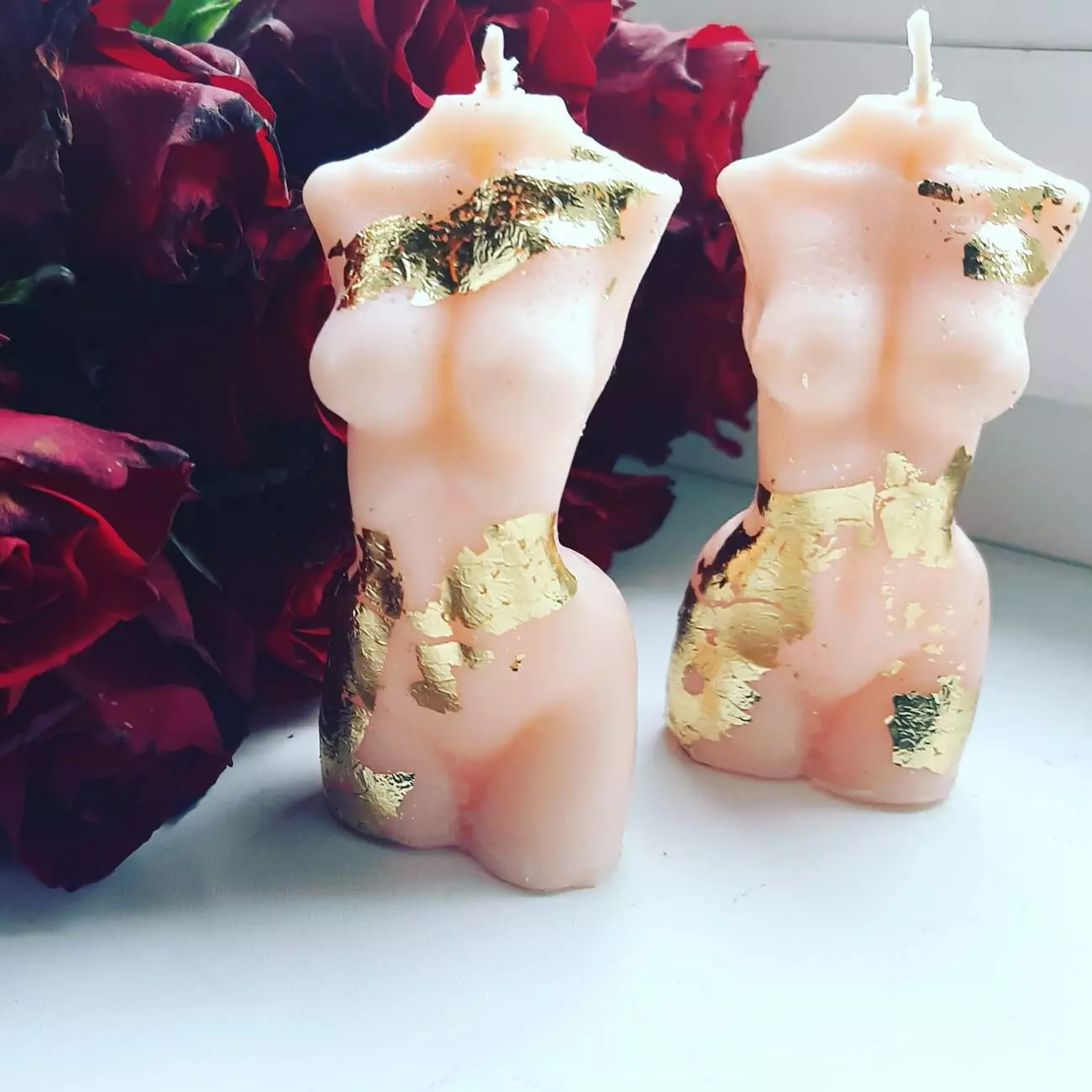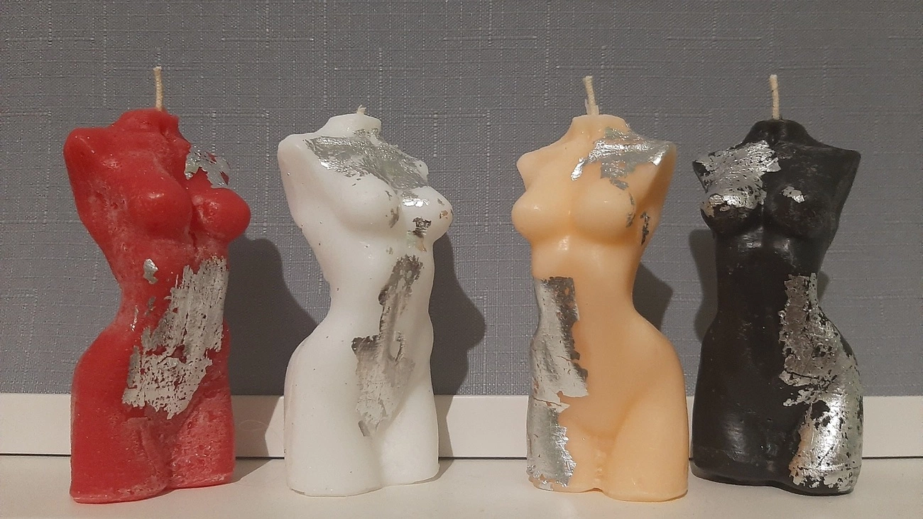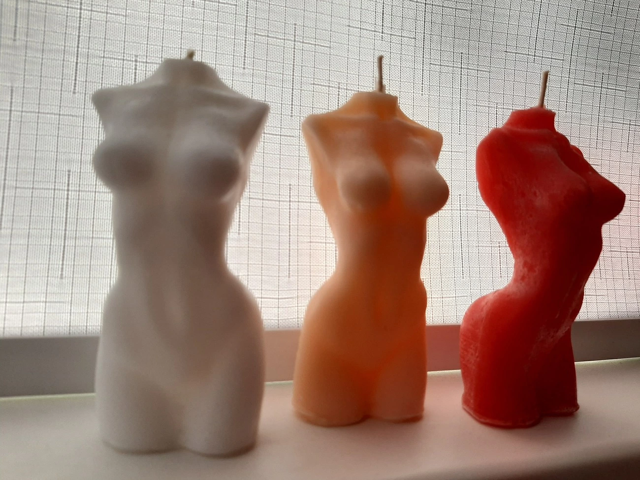 Свічки у формі жіночого тіла виготовлені із свічної маси ( харчовий парафін + стеарин). Таку свічку можна виготовити в білому, рожевому, бежевому, жовтому, сірому, кавовому, персиковому, блакитному та ніжно - зеленому кольорах. Натуральний гніт сприяє якісному горінню без кіптяви.