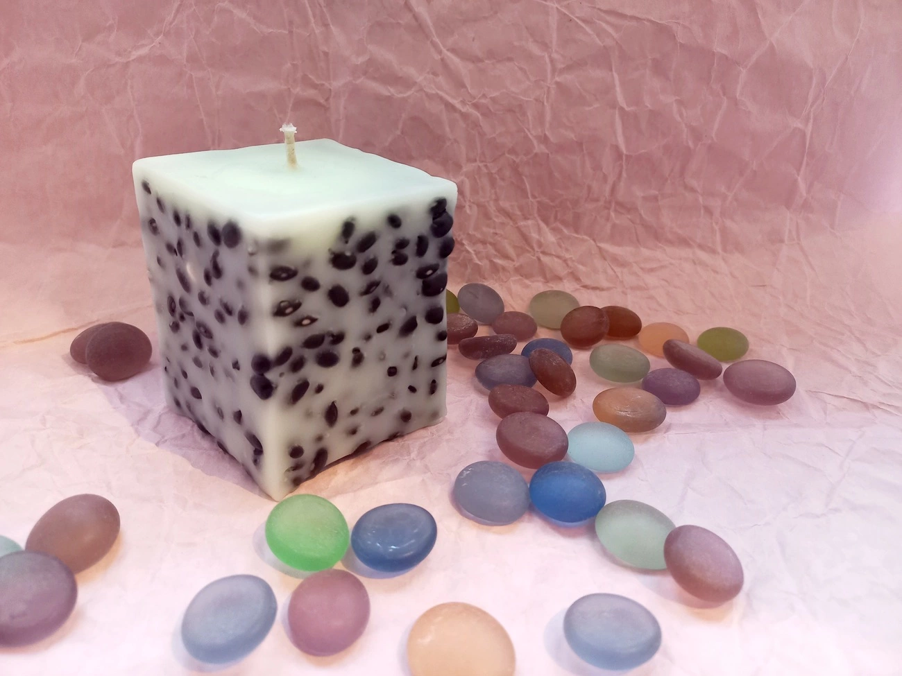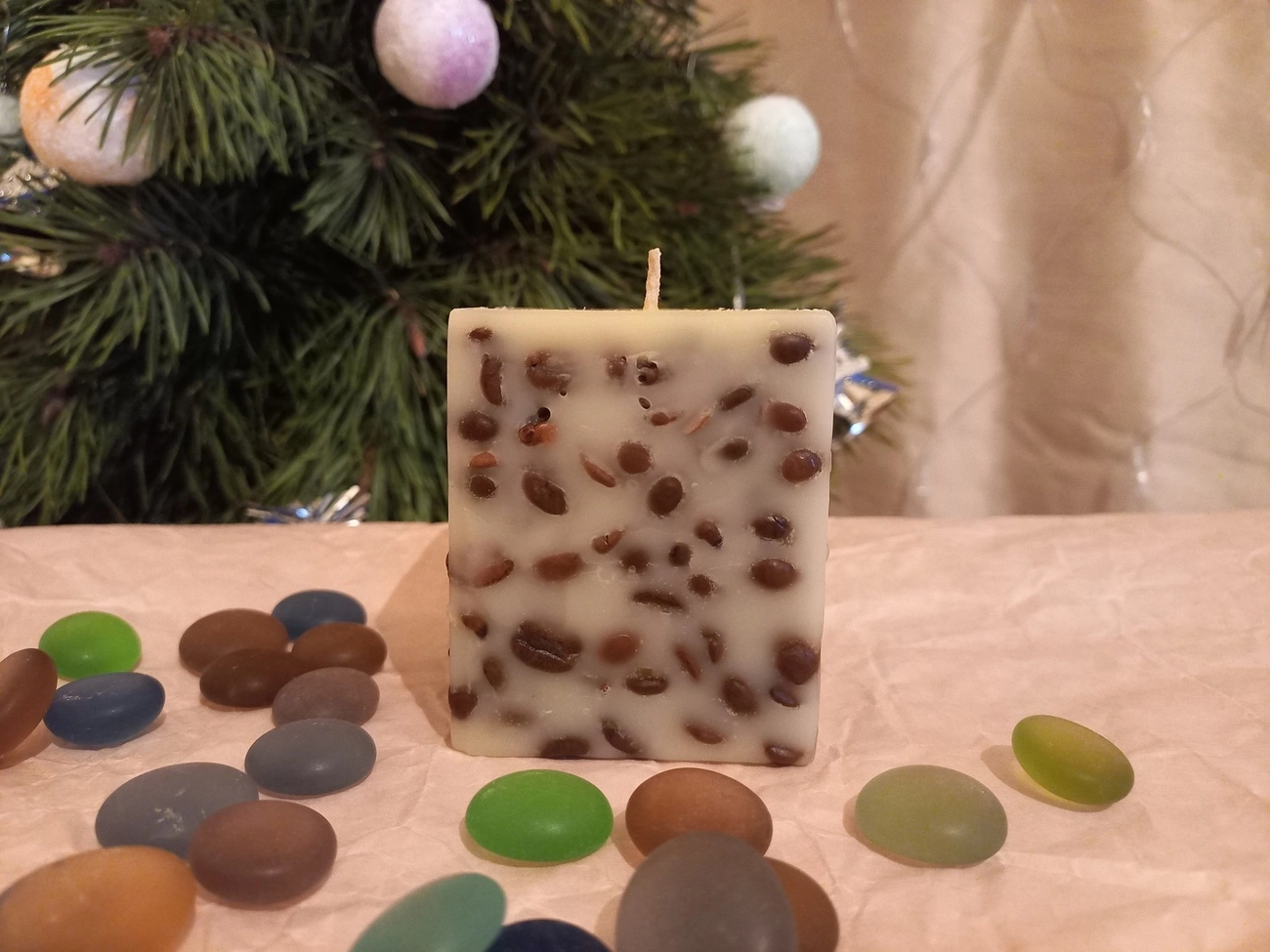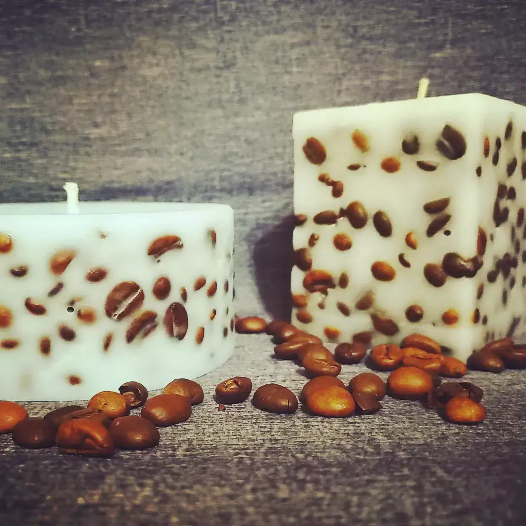 Свічка з зернами кави і неперевершеним кавовим ароматом. Розміри 7×7×6 см. Колір може бути різним.