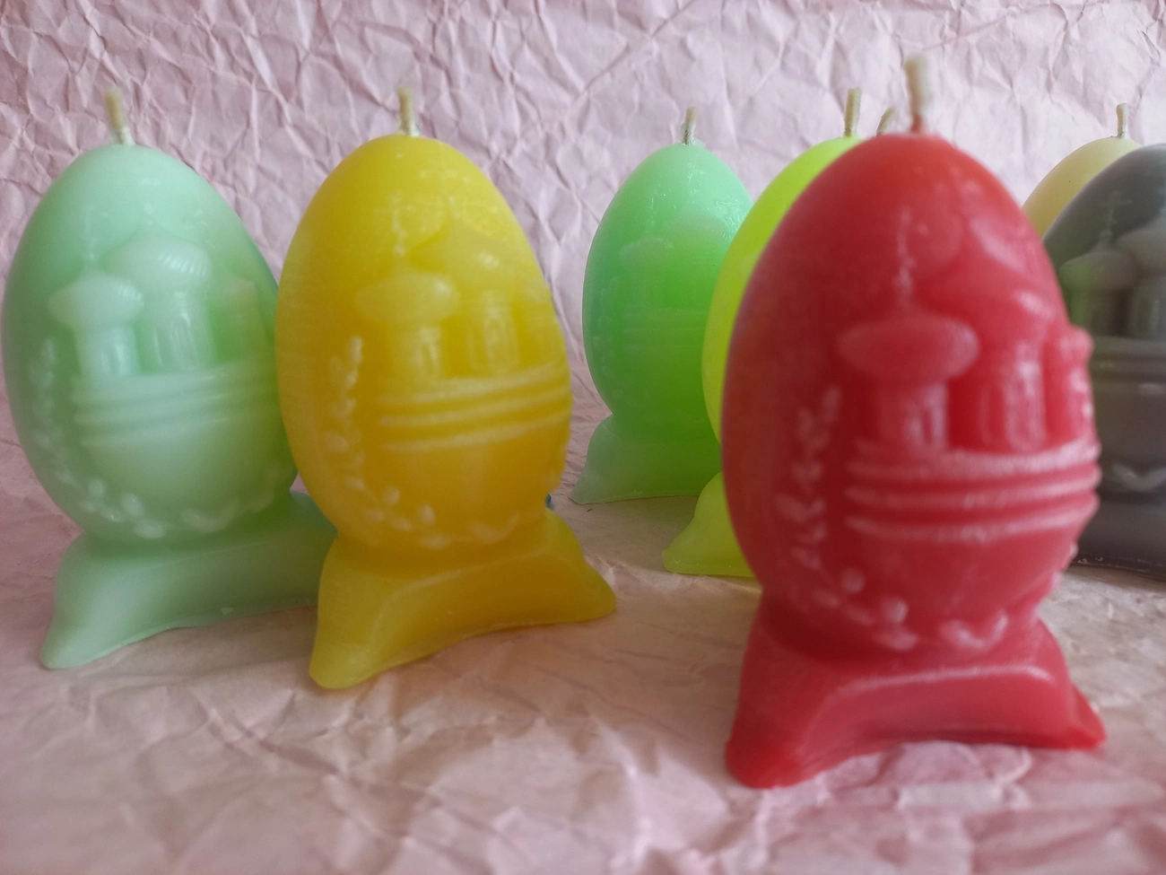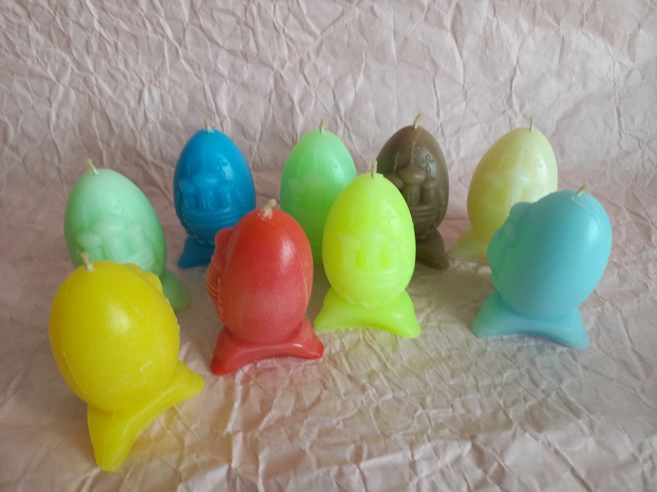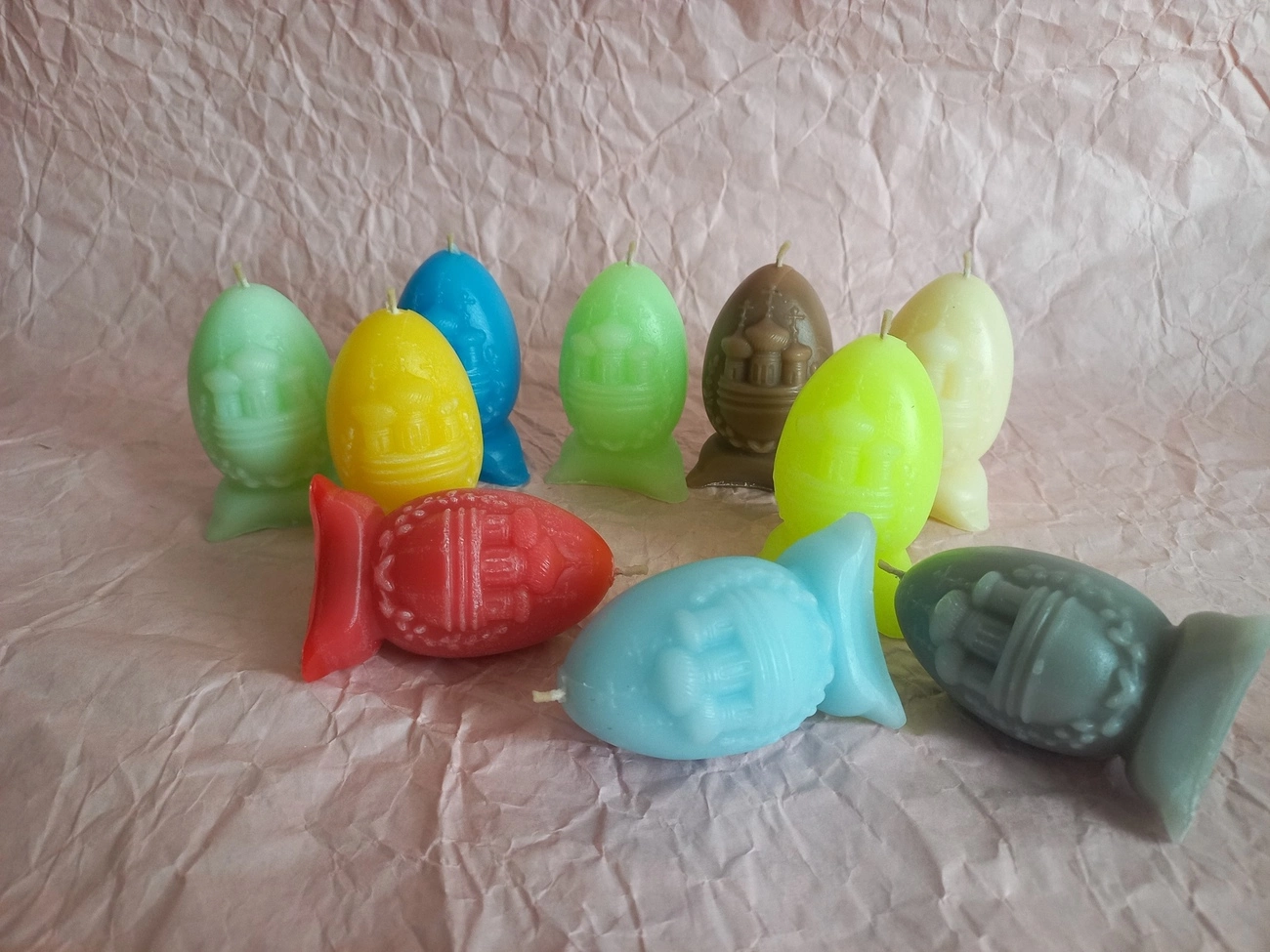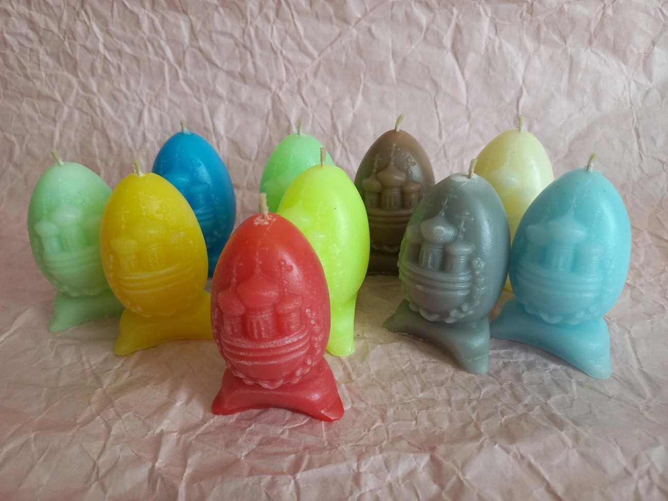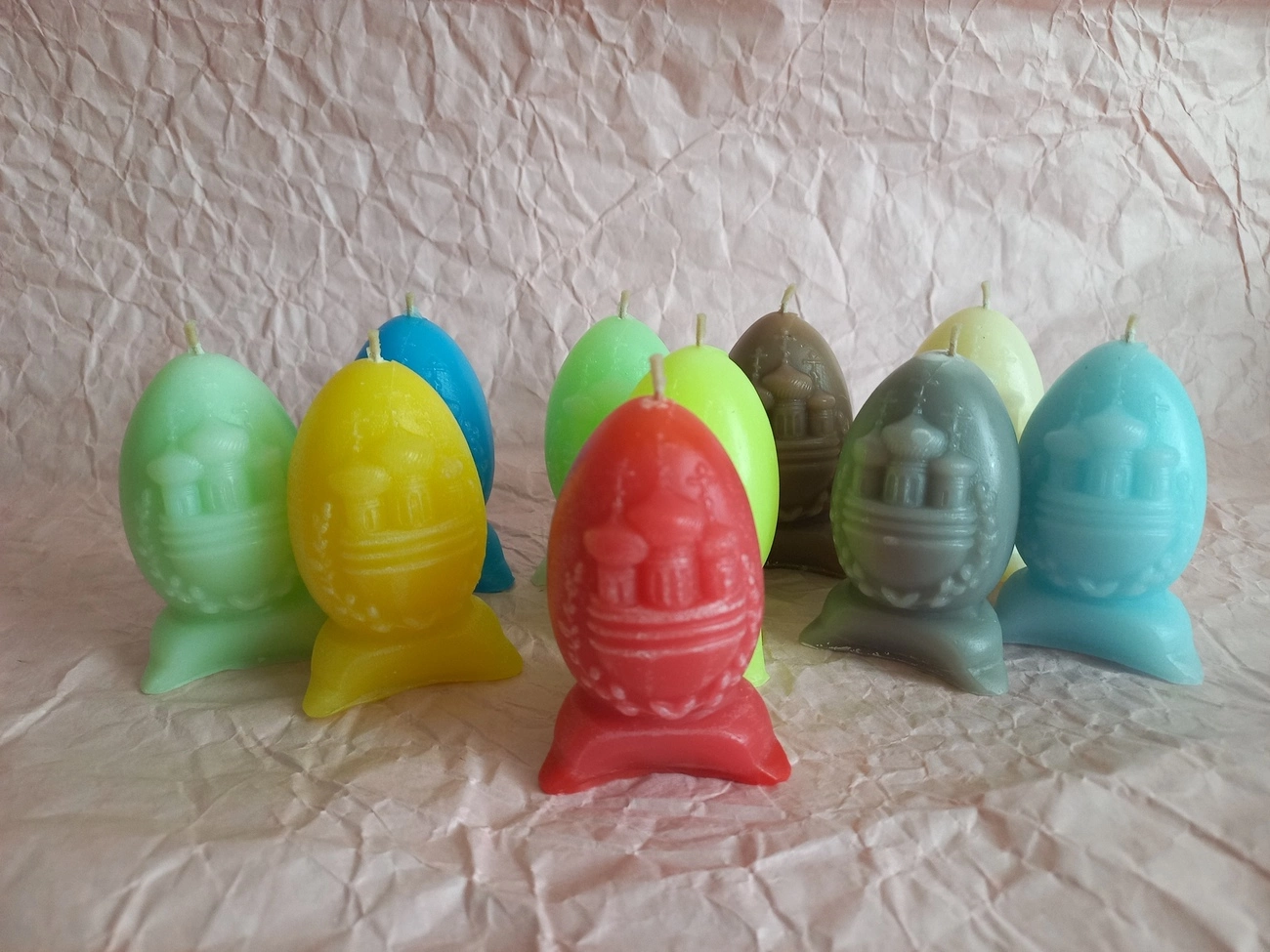 Виготовлені із харчового парафіну зі стеарином, тому горять якісно. Колір і аромат можна вибирати пои замовленні. Висота 7, 5 см. Тому нагадує справжнє яйце