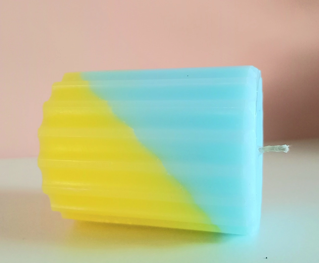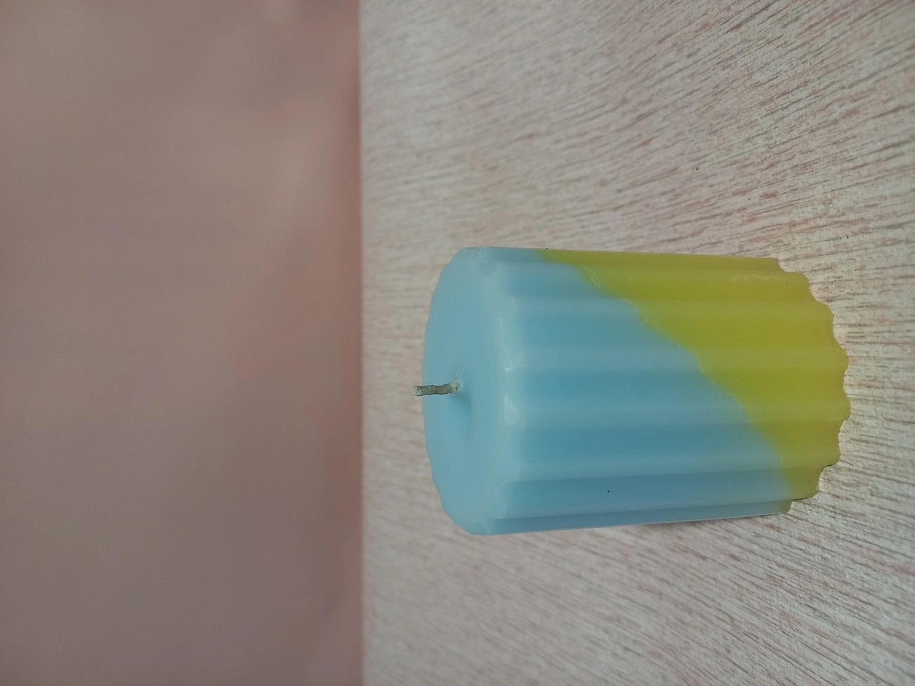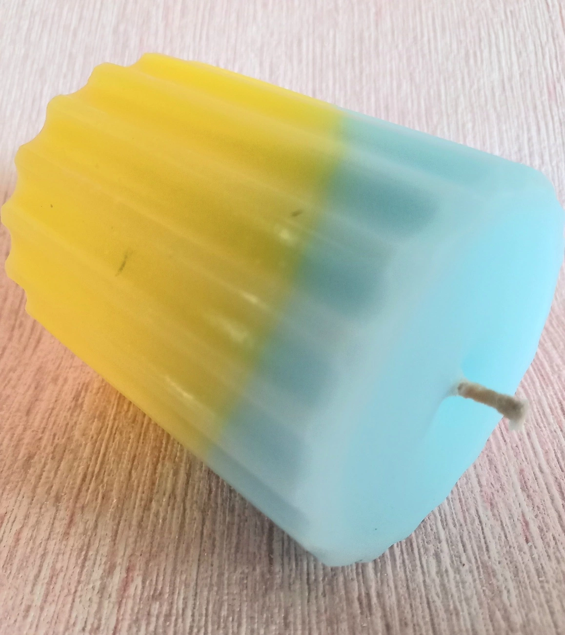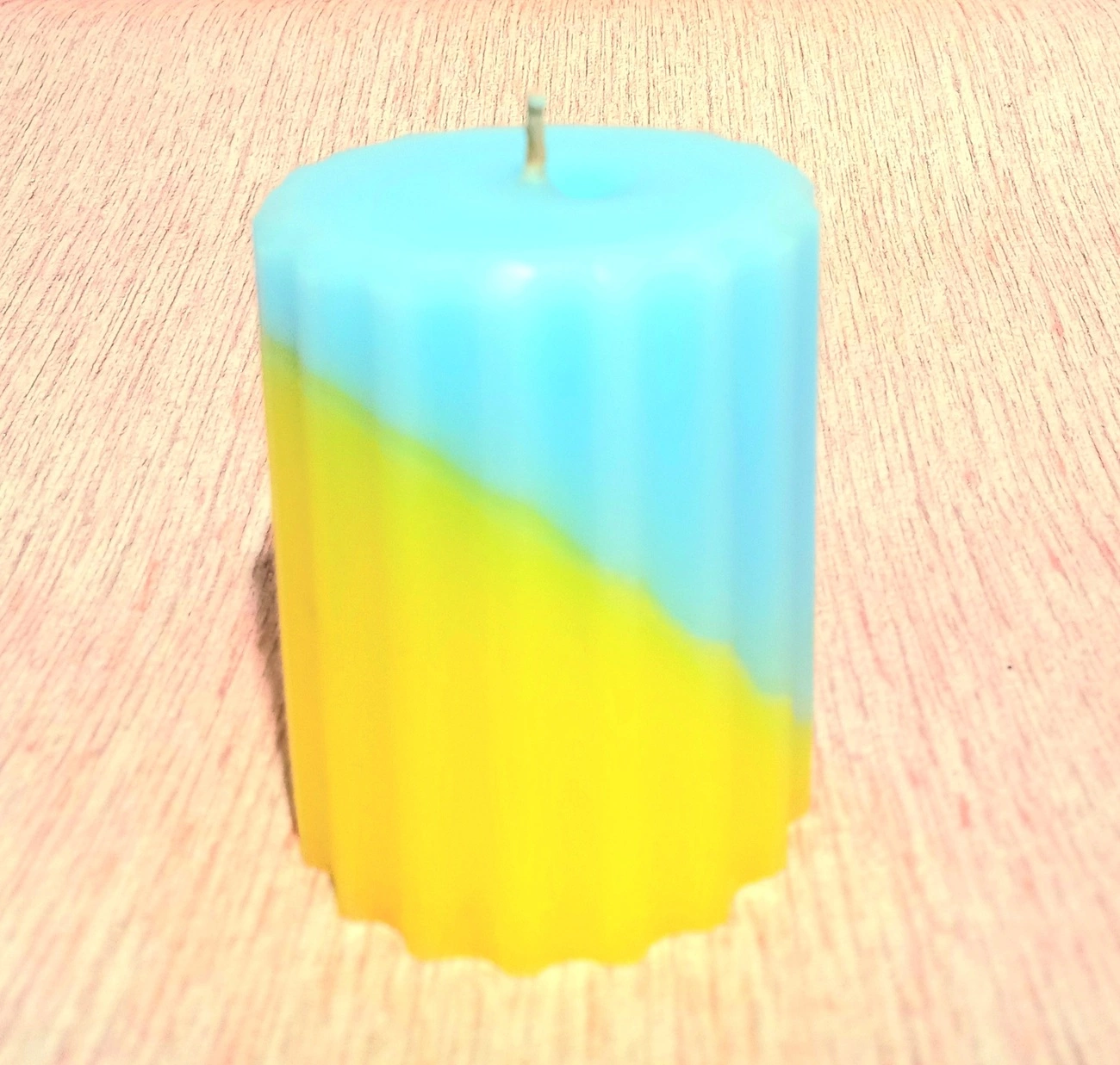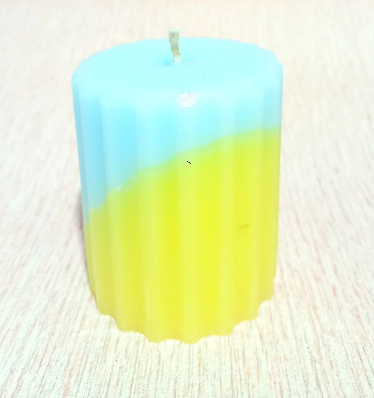 Рифлена жовто-блакитна свічка зараз у тренді. Виготовлена із харчового парафіну з додаванням стеарину. Гніт натуральний. Горить довго